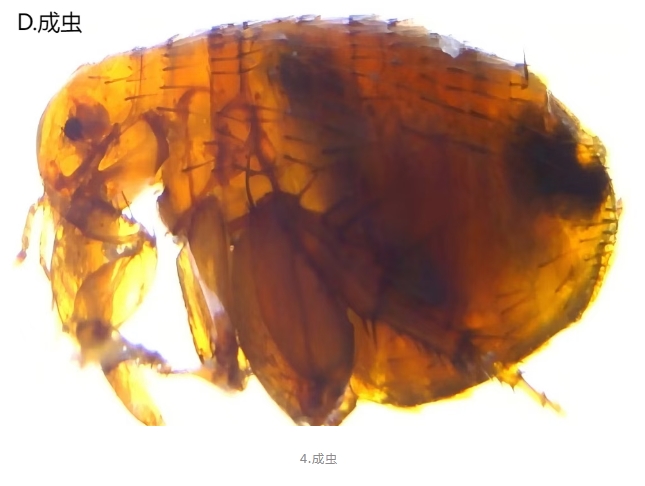 印鼠客蚤屬于完全變態(tài)昆蟲,成蟲兩側(cè)扁平,棕黃色至深褐色,體長一般為3毫米左右。其生活史包括卵、幼蟲、蛹和成蟲四個階段。卵為橢圓形、暗黃色,表面光滑,在適宜的溫濕環(huán)境下可在2-7天內(nèi)孵化。幼蟲呈蛆形,白色或淡黃色,以環(huán)境中各種有機(jī)碎屑為食。幼蟲經(jīng)歷三齡、蛻皮兩次后成熟,隨后吐絲結(jié)繭化蛹。蛹具有成蟲雛形,并逐漸變?yōu)榈厣?-2周后羽化為成蟲。