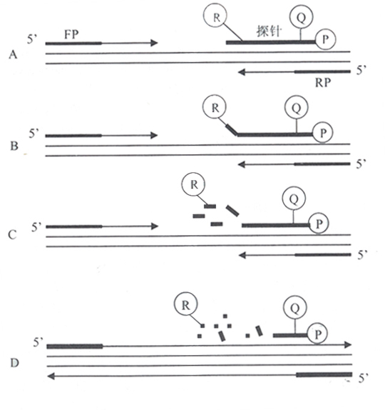 (D)聚合完成(R:FAM;Q:TAMRA;FP:上游引物;RP:下游引物)