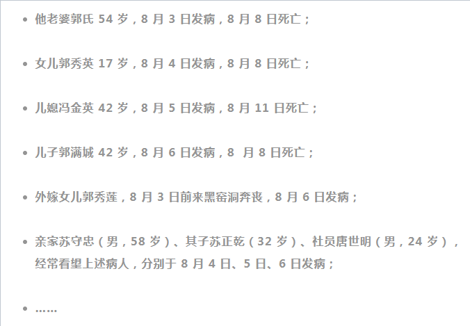 偶爾到病家探望病人和吊喪的鄉(xiāng)鄰……凡是跟病人有過密切接觸的人都一一倒下,