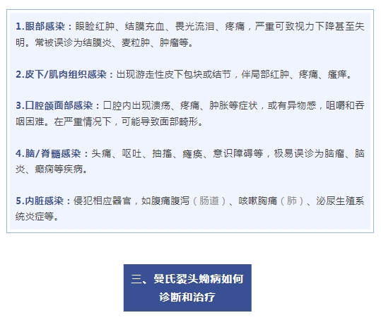 一旦出現(xiàn)可疑癥狀如不明原因的皮下包塊、反復(fù)眼疾、頭痛等,感到身體不適,務(wù)必到正規(guī)醫(yī)療機構(gòu)就診,科學(xué)治療,勿信偏方。