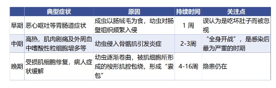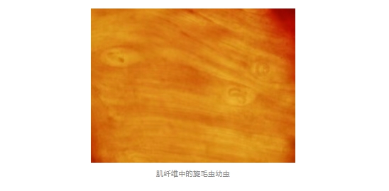 成蟲期:成蟲會在人體的小腸中停留幾周甚至幾個月來“產(chǎn)子”(卵胎生)。產(chǎn)出的幼蟲“寶寶”穿透腸壁,隨著血液和淋巴系統(tǒng)擴散到全身肌肉中,形成“囊包”。